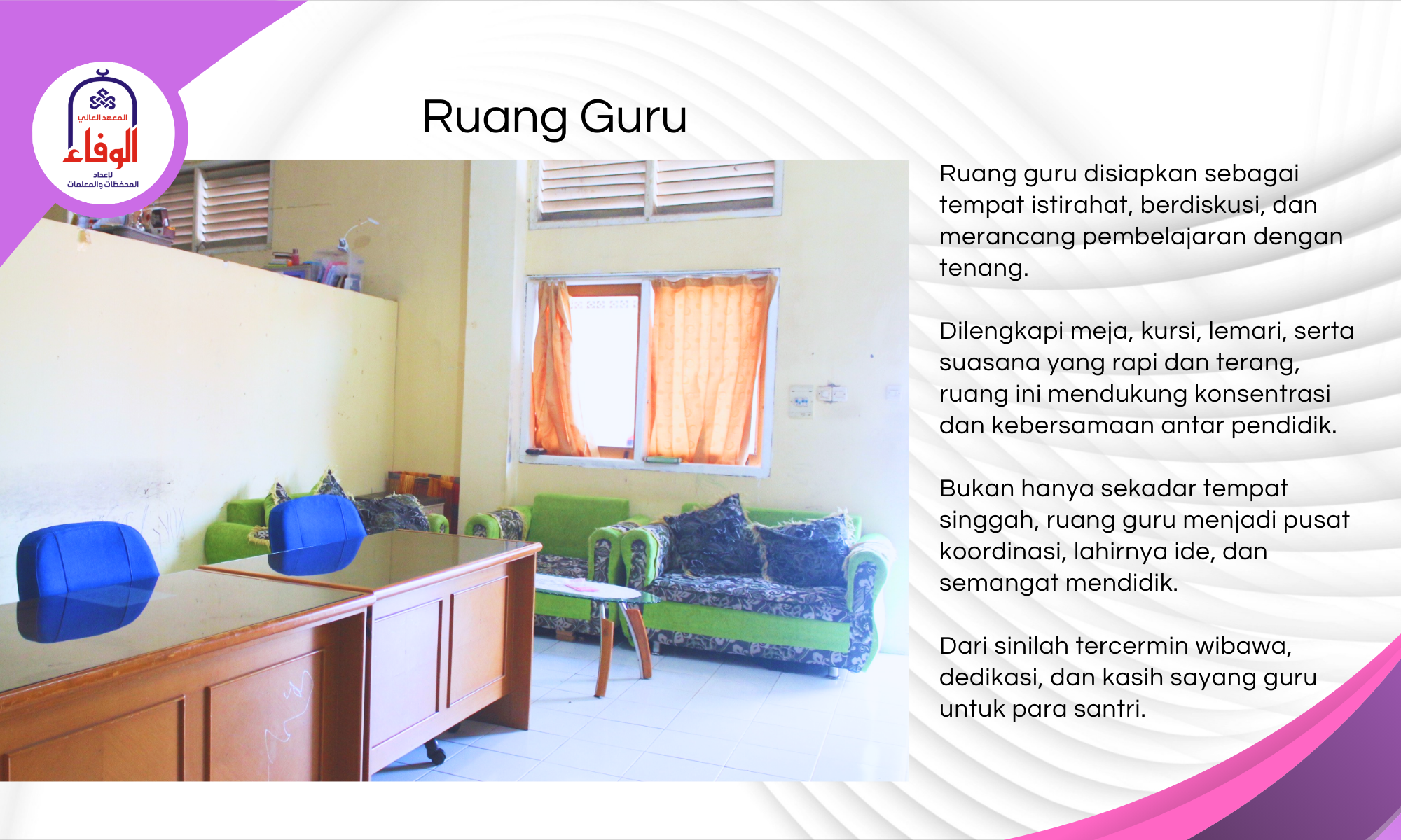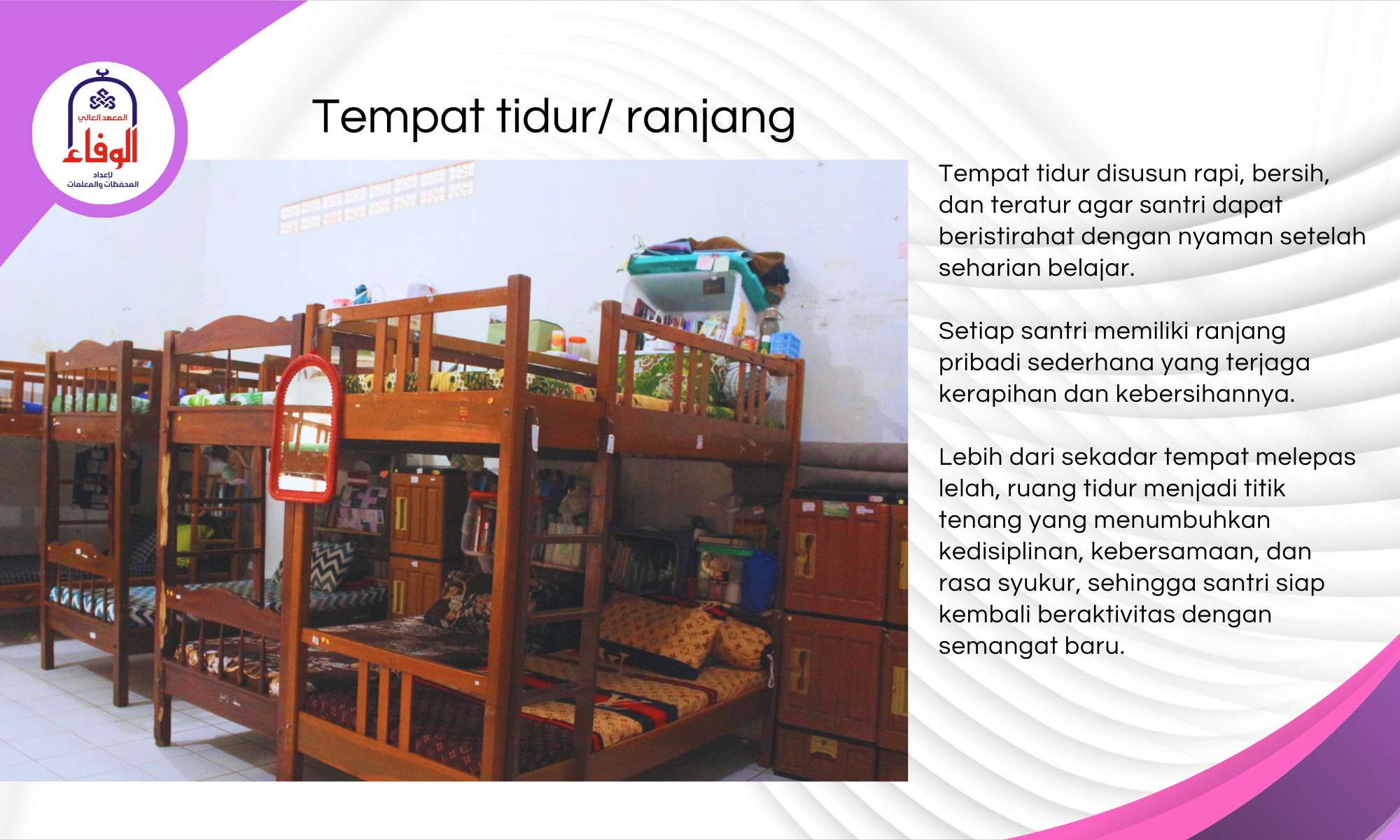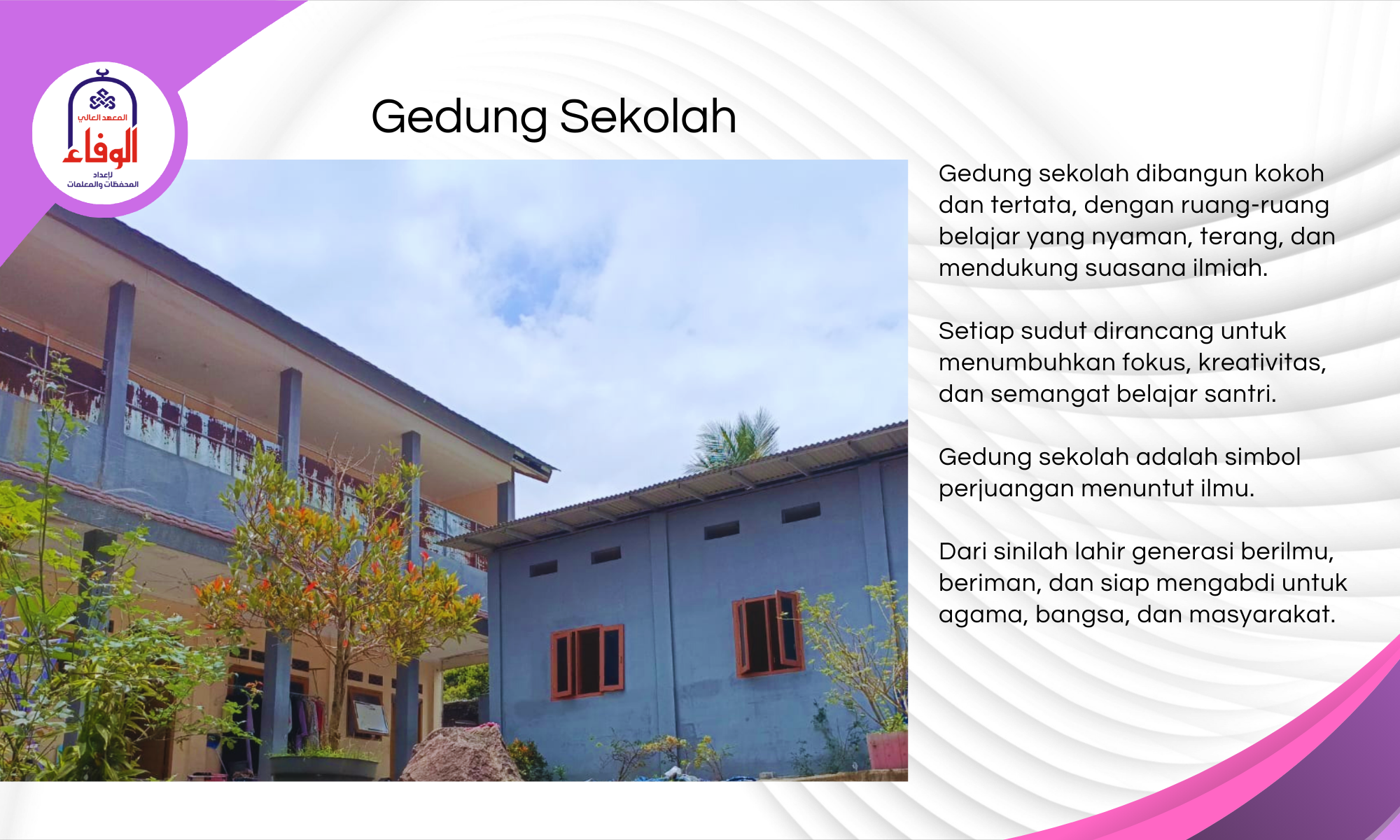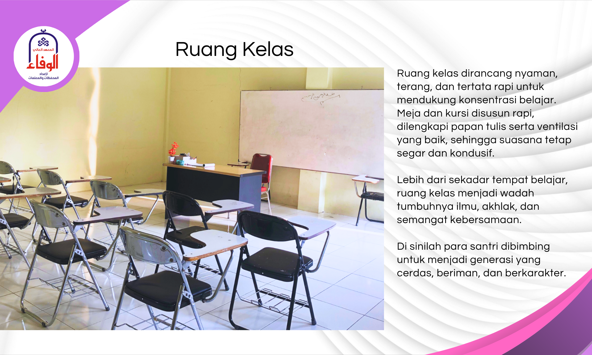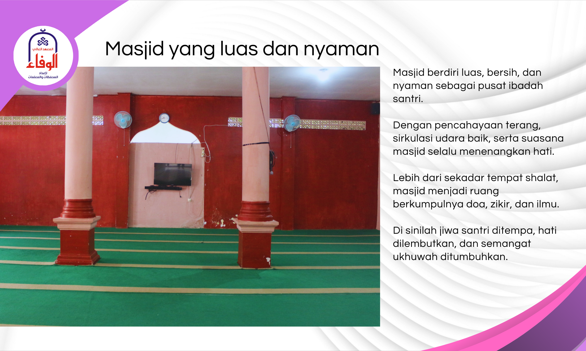 Tidak hanya menawarkan keteduhan fisik dari alam sekitarnya, Mahad Al-Wafa juga dirancang untuk menghadirkan keteduhan spiritual—dengan fasilitas pembelajaran yang lengkap, suasana ibadah yang khusyuk, serta sistem pembinaan yang terpadu dan berlandaskan manhaj Ahlus Sunnah wal Jama’ah.