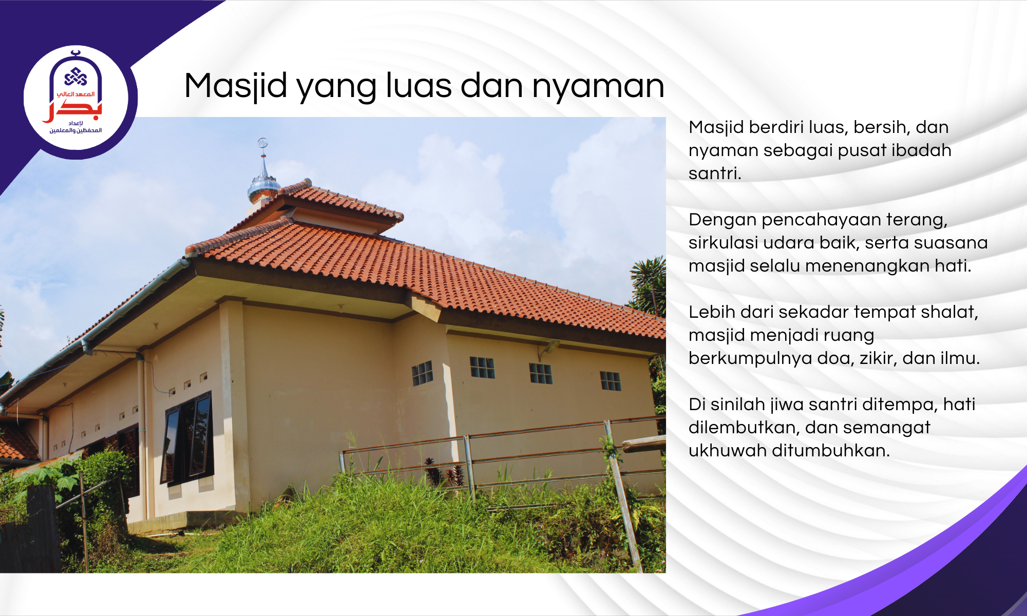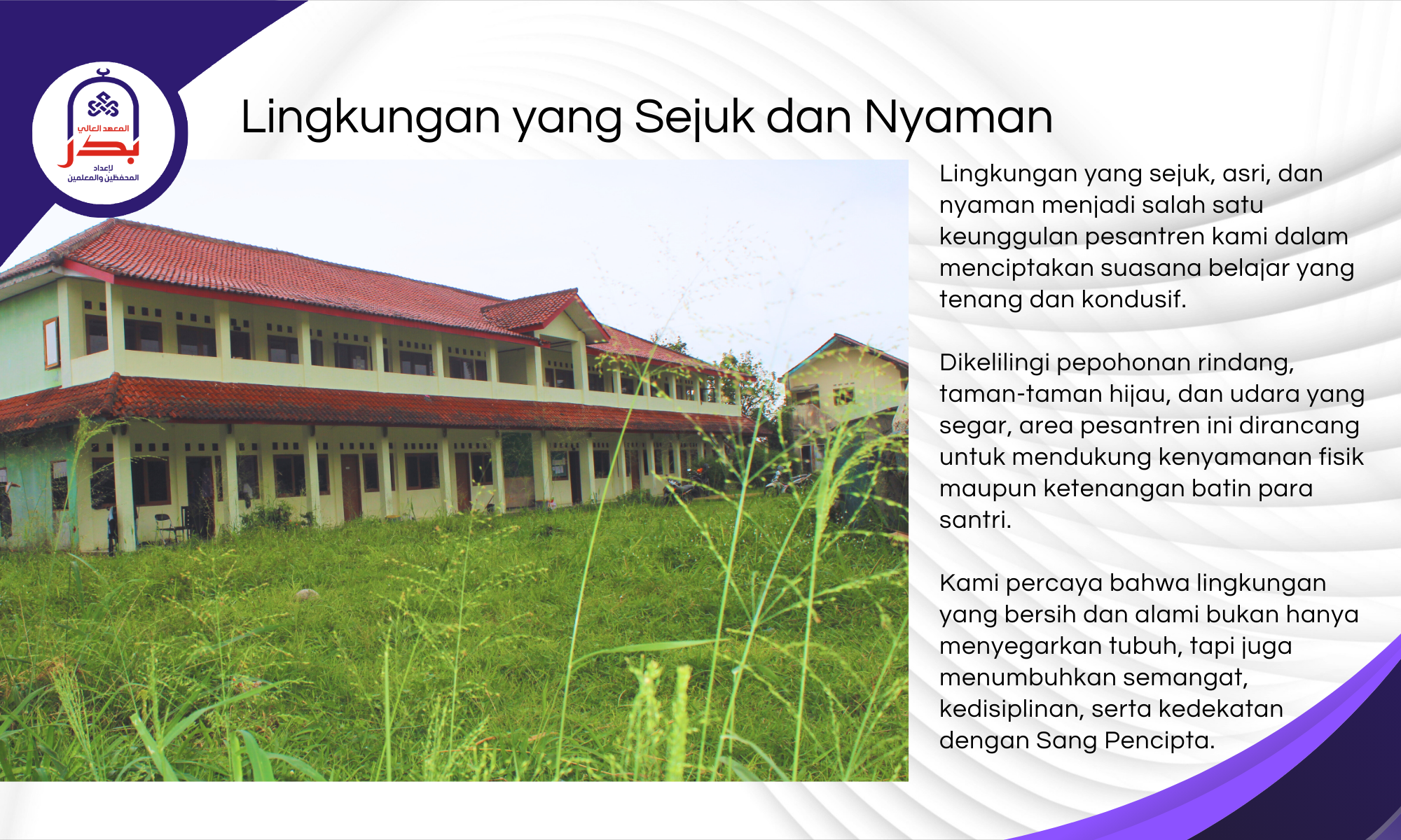 Dengan lingkungan yang asri, tenang, dan bersih, mahad ini menjadi tempat ideal bagi para penuntut ilmu untuk menghafal, memahami, dan mengamalkan Al-Qur’an dalam suasana yang benar-benar mendukung ketenangan hati dan kejernihan pikiran.
