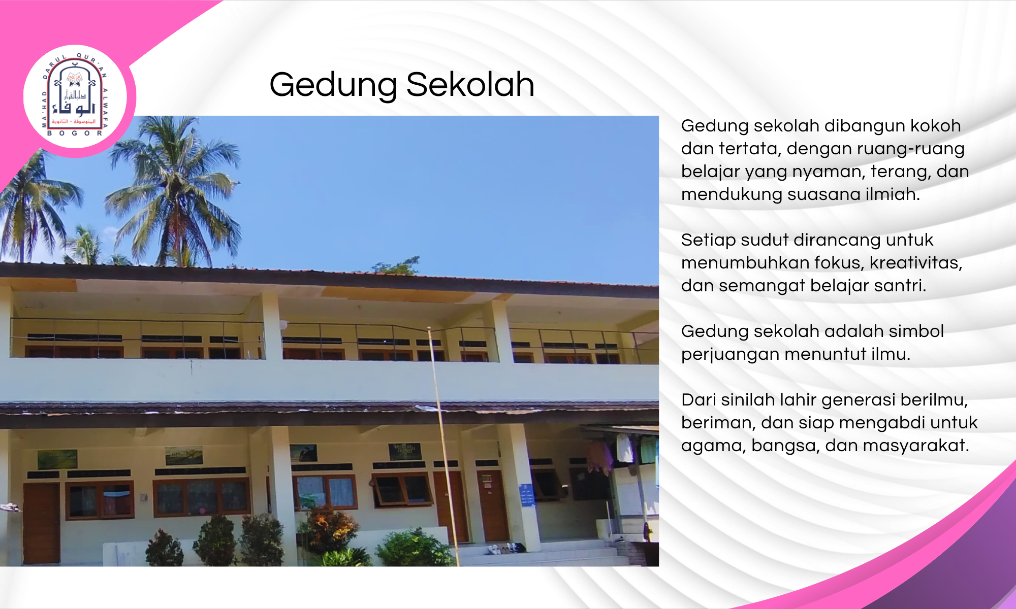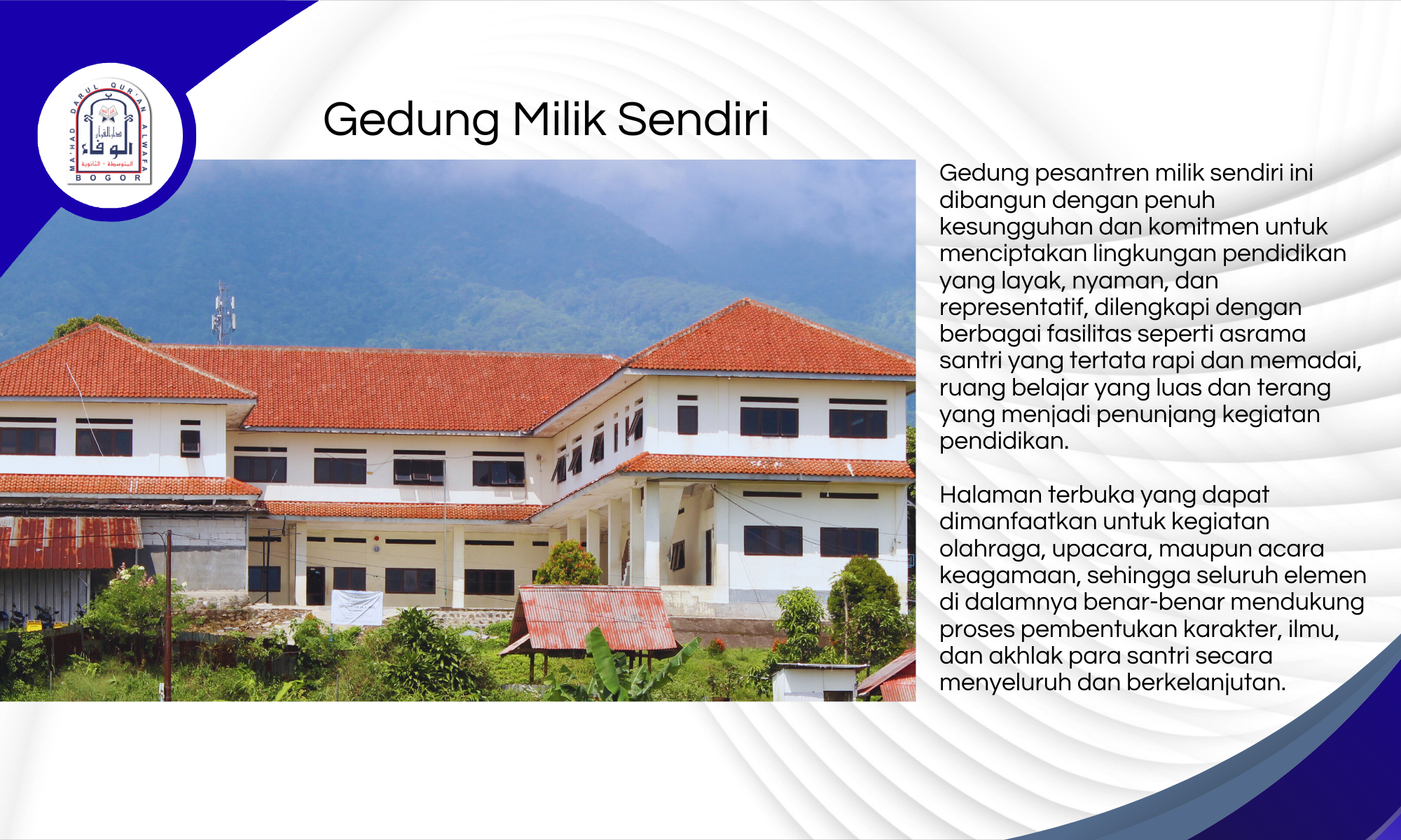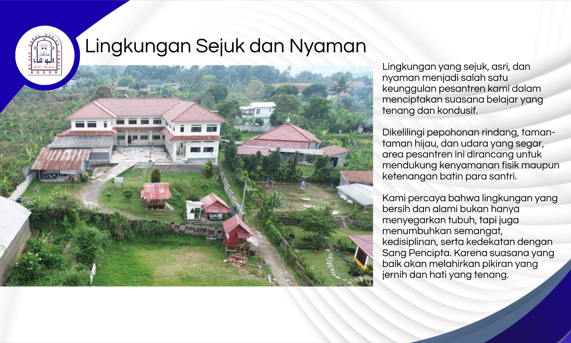 Mahad Darul Qur’an Al-Wafa Bogor berdiri megah di kawasan Tamansari, Kabupaten Bogor, sebuah wilayah yang dikelilingi oleh hijaunya alam, udara pegunungan yang segar, dan jauh dari hiruk-pikuk perkotaan.