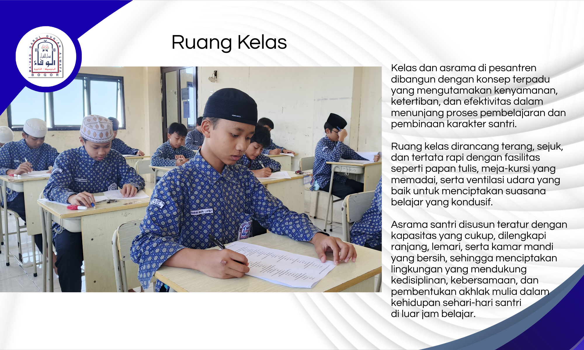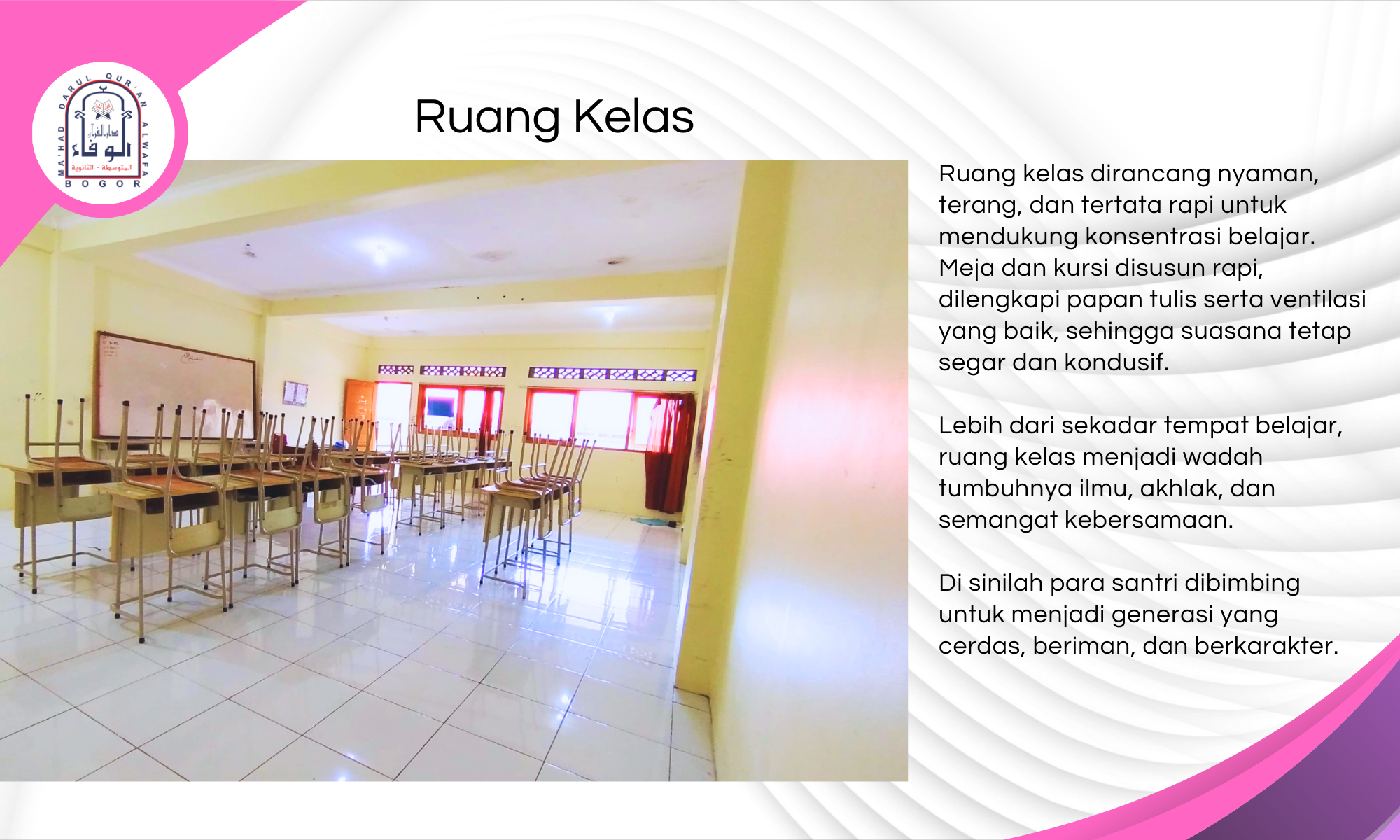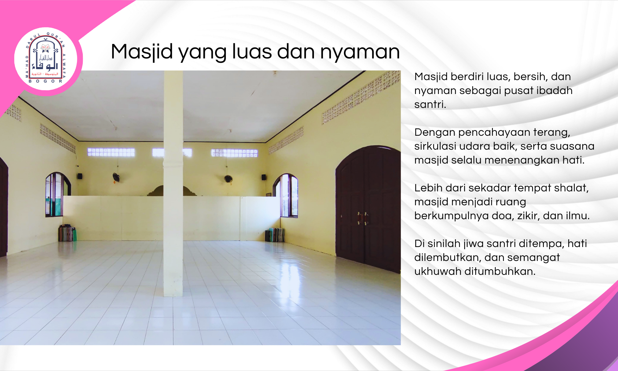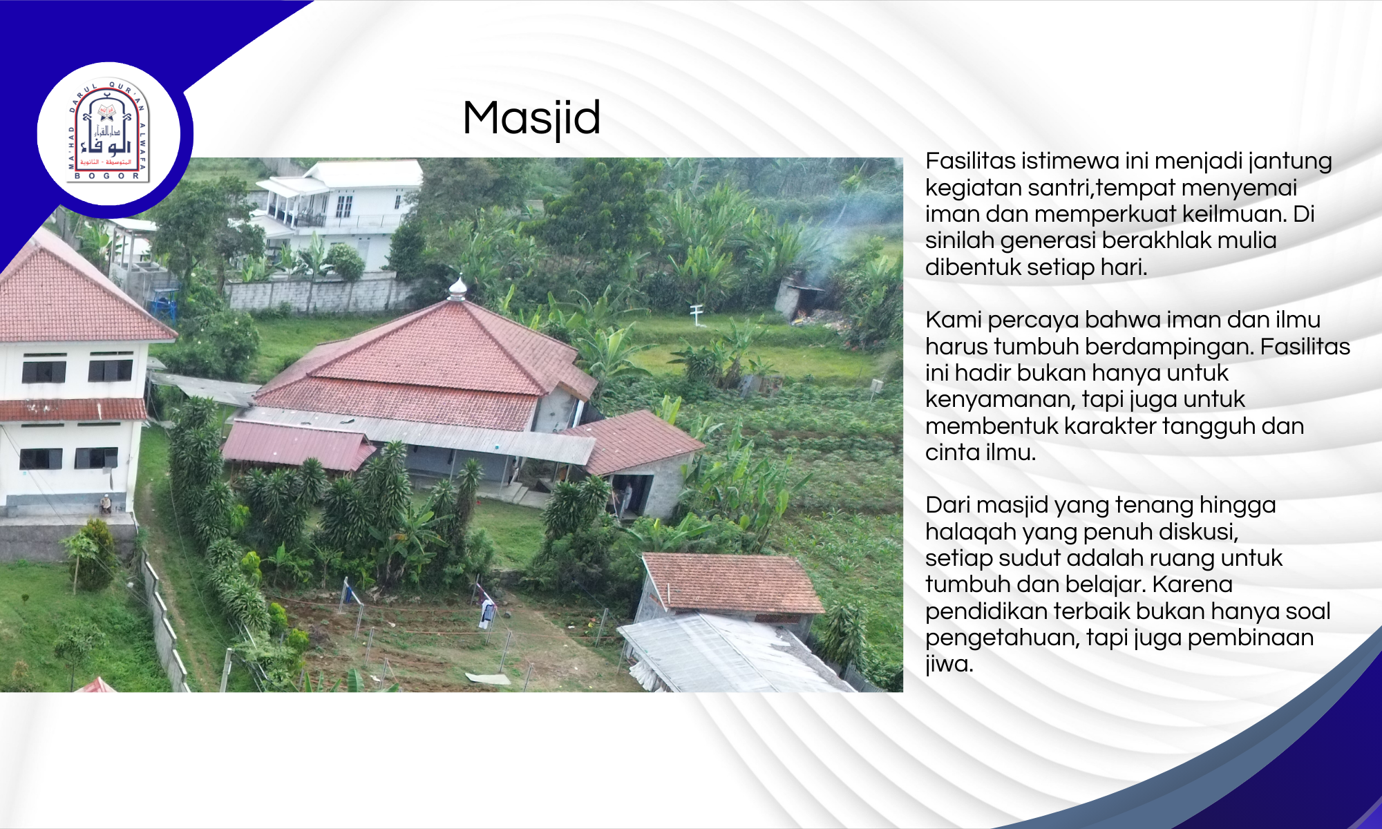 Tidak hanya menawarkan keteduhan fisik dari alam sekitarnya, Mahad Al-Wafa juga dirancang untuk menghadirkan keteduhan spiritual—dengan fasilitas pembelajaran yang lengkap, suasana ibadah yang khusyuk, serta sistem pembinaan yang terpadu dan berlandaskan manhaj Ahlus Sunnah wal Jama’ah.