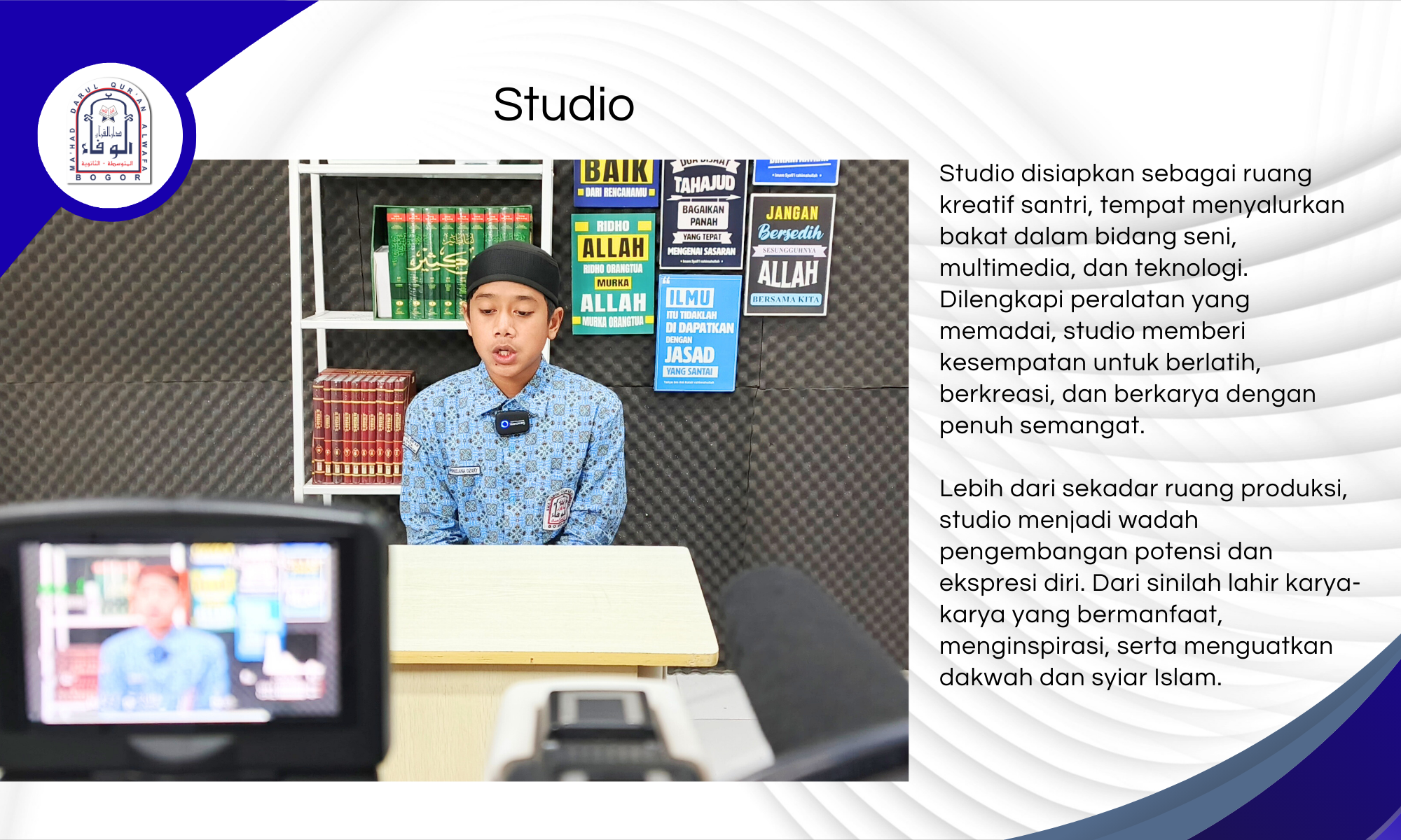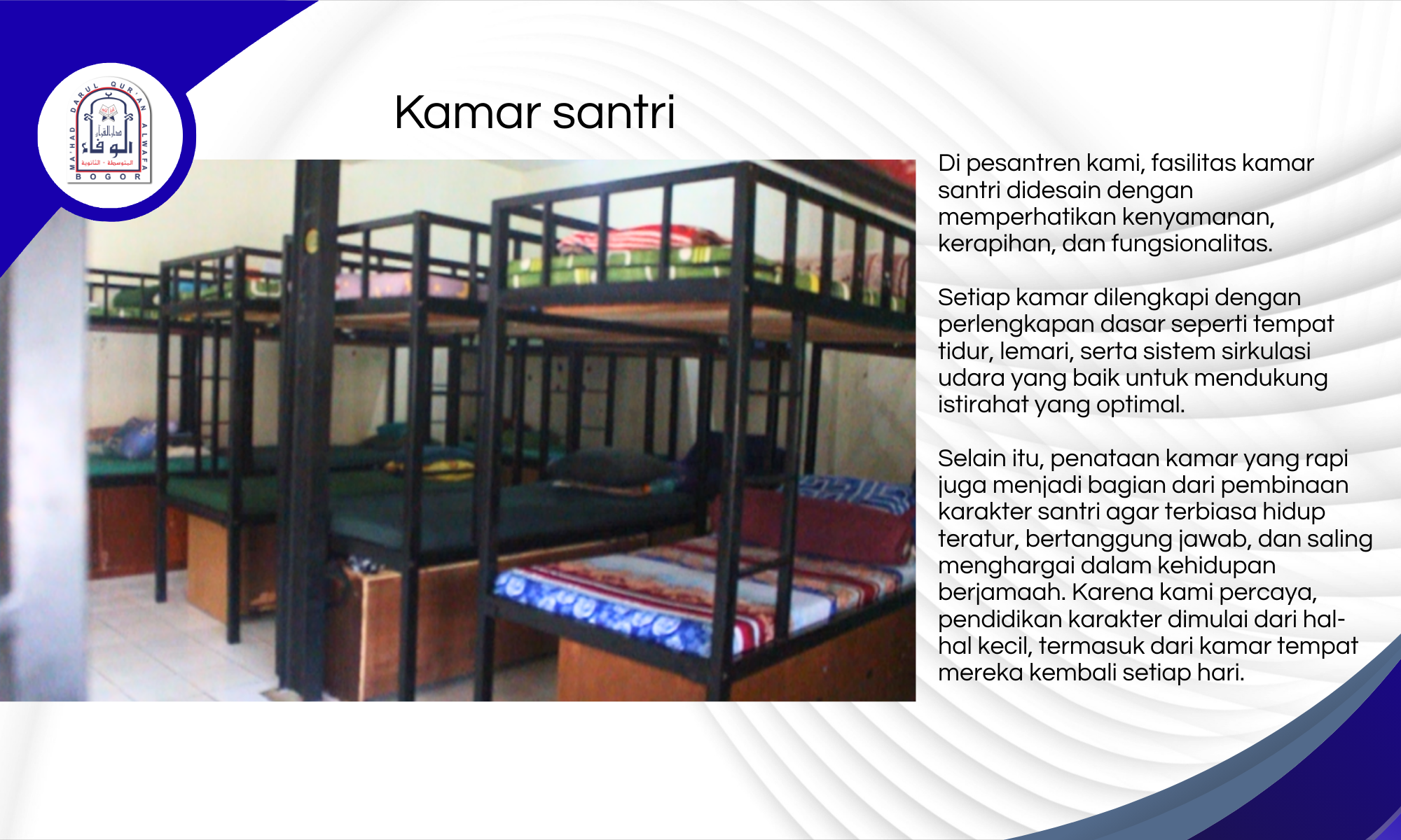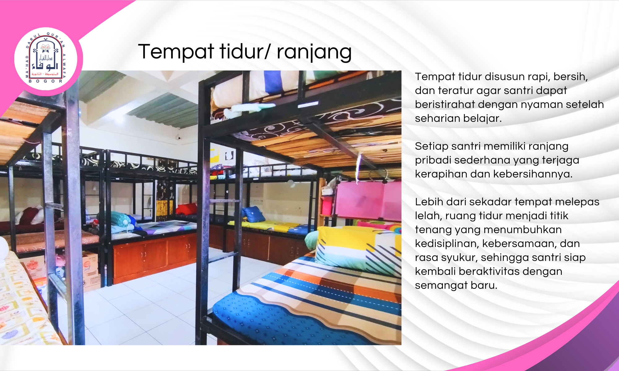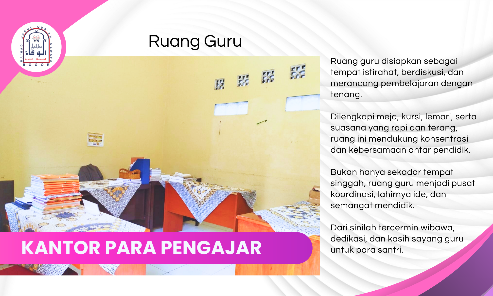 Tidak hanya menawarkan keteduhan fisik dari alam sekitarnya, Mahad Al-Wafa juga dirancang untuk menghadirkan keteduhan spiritual—dengan fasilitas pembelajaran yang lengkap, suasana ibadah yang khusyuk, serta sistem pembinaan yang terpadu dan berlandaskan manhaj Ahlus Sunnah wal Jama’ah.